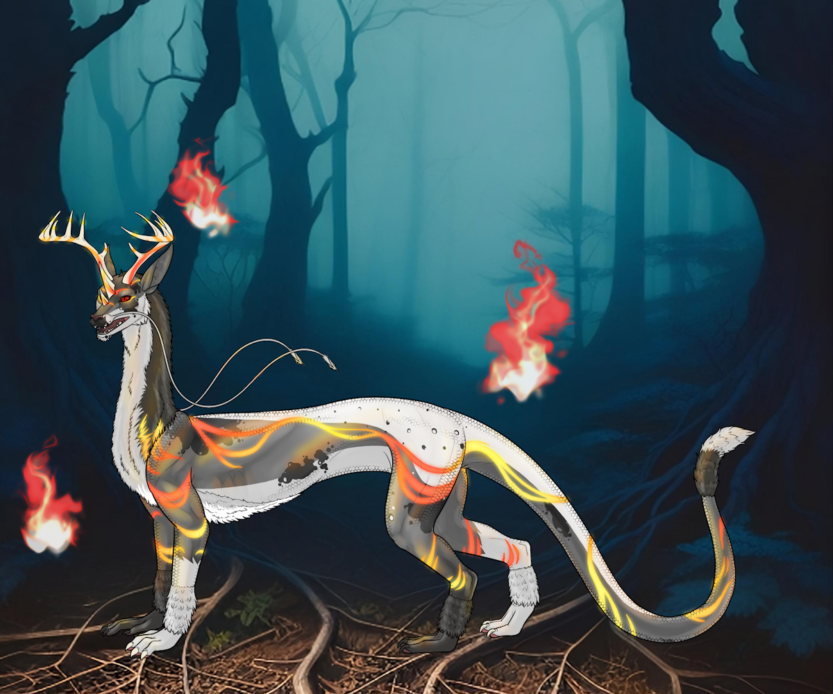 R. Short Belly Fur, D. Shiny, R. Short Leg Fur, O. Double Whiskers, D. Short Beard, D. Kirin Horns, O. Medium Back Fur, R. Red Fire, D. Deer Horns, D. Scales, Keratin Energy, Extra Energy