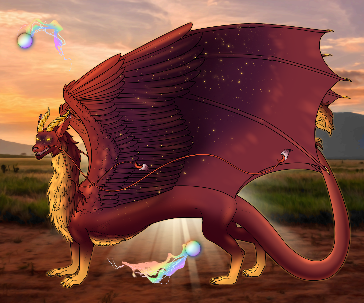 D. Curved Horns, R. Short Beard, D. Chimeric Wings, D. Double Whiskers, D. Rainbow Wisps, R. Golden Claws, R. Short Underbelly