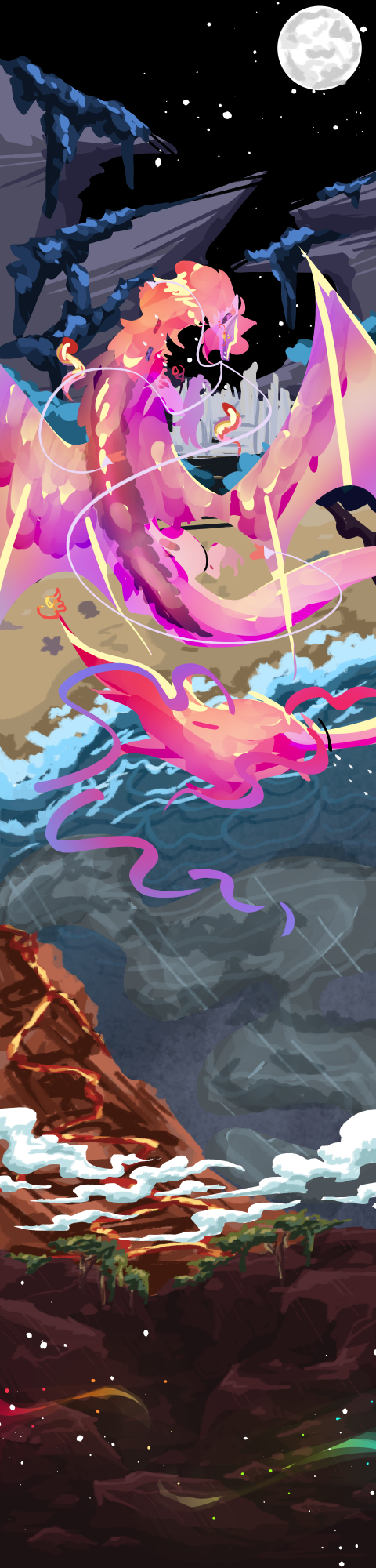 Ever since their descent Lyrid has been lost. They set out into this new world for knowledge. To learn of the people, the creatures, the places that inhabit the unknown world that Lyrid found themself in. From the barren crater where Lyrid’s life here began the journey began. Through the smoke of active volcanos and the beaches that lace the oceans at the edge of the world Lyrid flies. The moon caresses their feathers as they pass through the world. Leaving no mark behind and only taking the memories of new sights, Lyrid soars. They pass by the soaring islands among the clouds, the starry markings in their wings coloring the night.